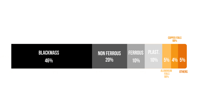 The objective for MTB, thanks to a system of crushing and sorting elements, is to recover all raw materials such as: blackmass, ferrous and non-ferrous metals or plastics.